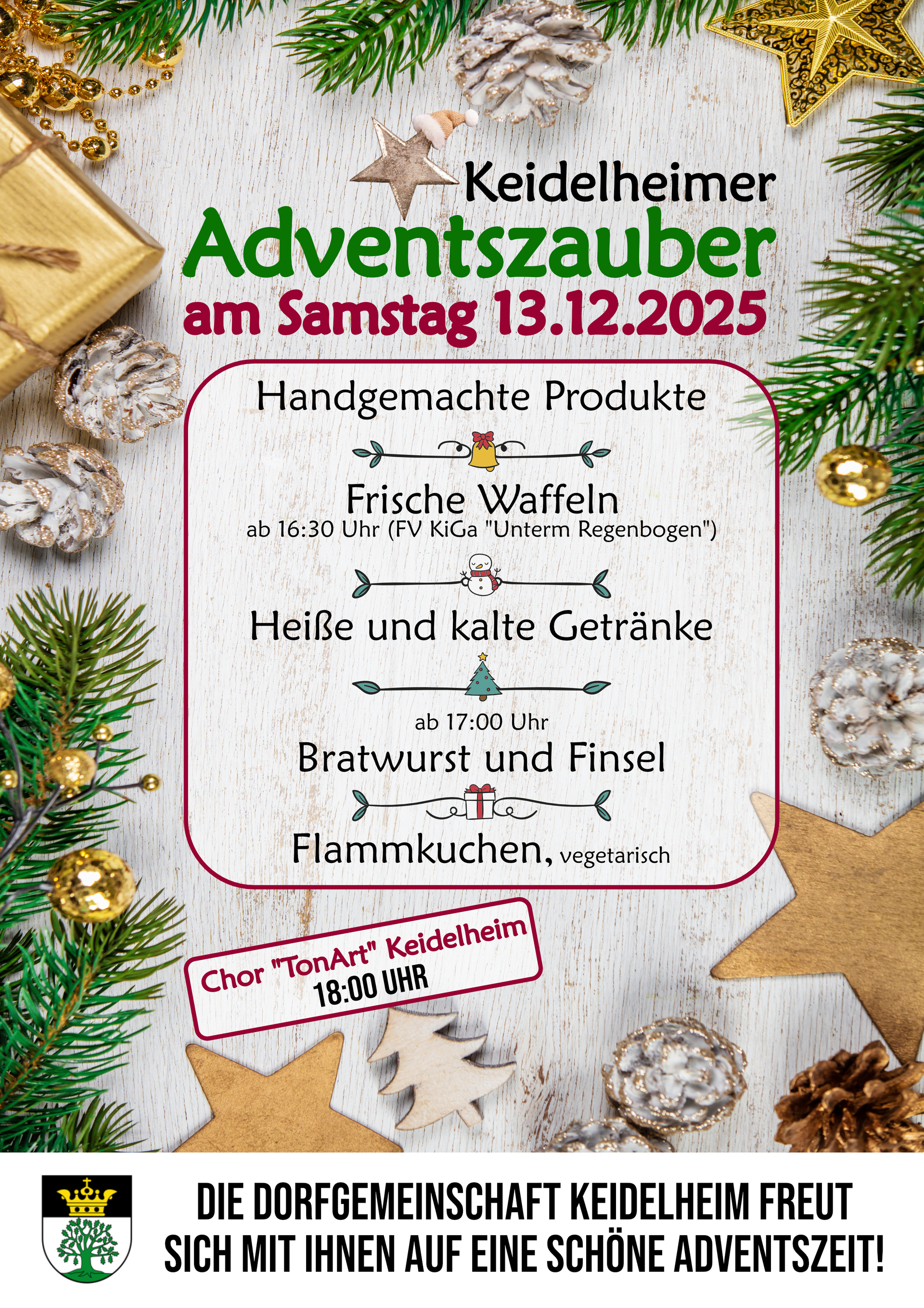 Am 13. Dezember lädt die Gemeinde Keidelheim herzlich zum stimmungsvollen Adventszauber ein. Der Förderverein des Kindergartens "Unterm Regenbogen" verwöhnt alle Besucherinnen und Besucher mit frisch gebackenen Waffeln. Dazu erwarten euch herzhafte Bratwurst, traditioneller Finsel sowie köstlicher vegetarischer Flammkuchen. Für warme und kalte Getränke ist bestens gesorgt – ein duftender Glühwein gehört selbstverständlich dazu. Gemeinsam möchten wir ein paar entspannte, festliche Stunden verbringen und die Vorfreude auf Weihnachten teilen. Wir freuen uns auf euren Besuch! 🎄✨