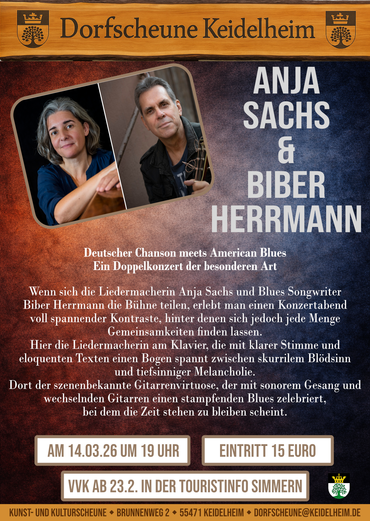 Deutscher Chanson meets American Blues - Ein Doppelkonzert der besonderen Art Wenn sich die Liedermacherin Anja Sachs und Blues Songwriter Biber Herrmann die Bühne teilen, erlebt man einen Konzertabend voll spannender Kontraste, hinter denen sich jedoch jede Menge Gemeinsamkeiten finden lassen. Hier die Liedermacherin am Klavier, die mit klarer Stimme und eloquenten Texten einen Bogen spannt zwischen skurrilem Blödsinn und tiefsinniger Melancholie. Dort der szenenbekannte Gitarrenvirtuose, der mit sonorem Gesang und wechselnden Gitarren einen stampfenden Blues zelebriert, bei dem die Zeit stehen zu bleiben scheint.