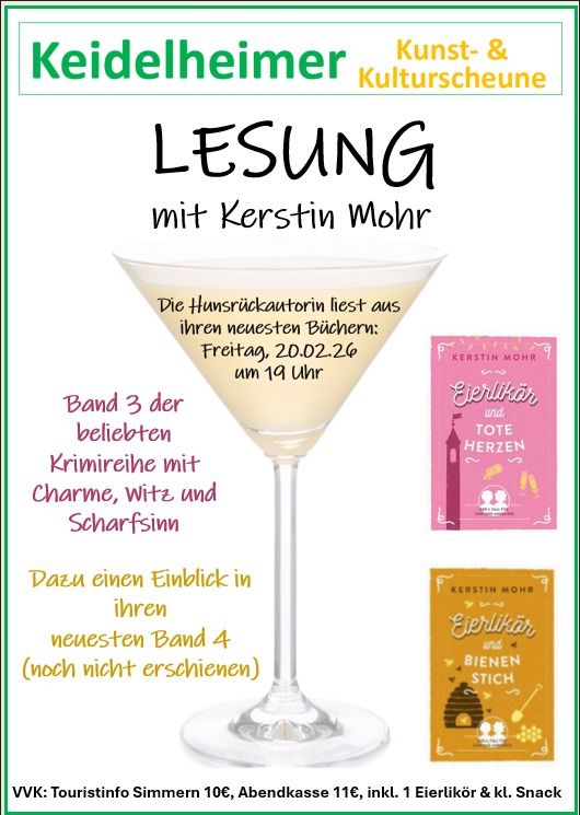 Am 20.02.2026 ist die Schriftstellerin Kerstin Mohr zu Gast in unserer Kunst- und Kulturscheune in Keidelheim. Sie liest aus dem dritten Band ihrer beliebten Reihe Eierlikör und tote Herzen und gibt zudem exklusive Einblicke in ihr noch unveröffentlichtes Werk Eierlikör und Bienenstich. Freuen Sie sich auf einen unterhaltsamen Abend voller Spannung, Humor und literarischem Genuss in besonderer Atmosphäre.