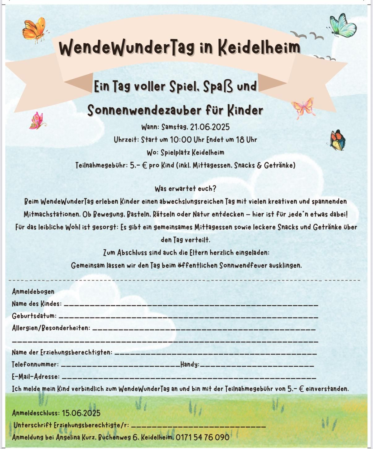 Am Samstag, dem 21. Juni ist es wieder soweit - der längste Tag und die kürzeste Nacht des Jahres stehen vor der Tür! Das wollen wir alle natürlich gebührend feiern - mit unserer traditionellen Sonnenwendfeier auf dem Keidelheimer Spielplatz. Zuvor findet der WendeWunderTag für Keidelheimer Kinder statt. Wir bitten um Anmeldung. Die beiden Veranstaltungen gehen nahtlos über.