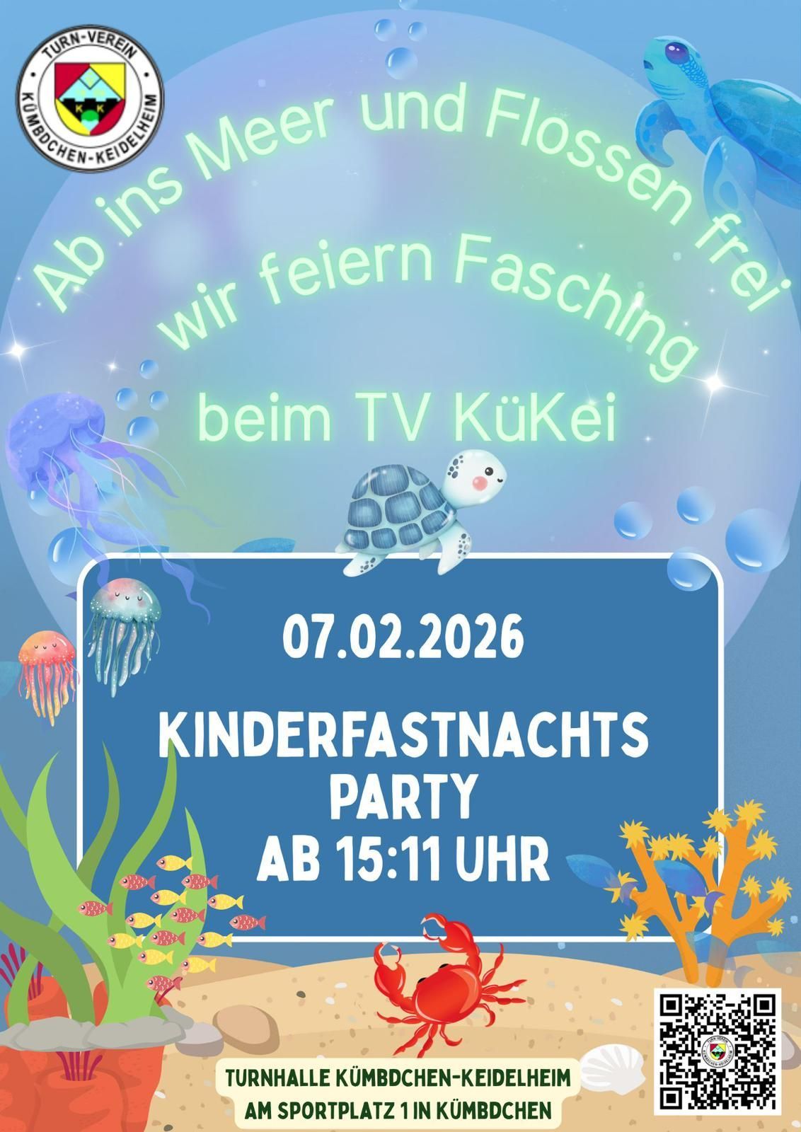 Taucht ab ins Meer und feiert Fasching! 🐢🌊 Am 07.02.2026 lädt der TV Kümbdchen-Keidelheim zur bunten Kinderfastnachtsparty ein. Ab 15:11 Uhr verwandelt sich die Turnhalle in Kümbdchen in eine fröhliche Unterwasserwelt mit Spaß, Musik und guter Laune. Kommt vorbei, verkleidet euch und feiert mit uns ein unvergessliches Faschingserlebnis für Kinder! 🎉